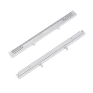 Valkoinen ritilänkannatinlista astiakaapinhyllyille. Kiinitetään kalusterunkoon sekä 5mm tapeilla että ruuveilla. Myydään pareittain. Tappien säätöväli 185 - 240 mm.
