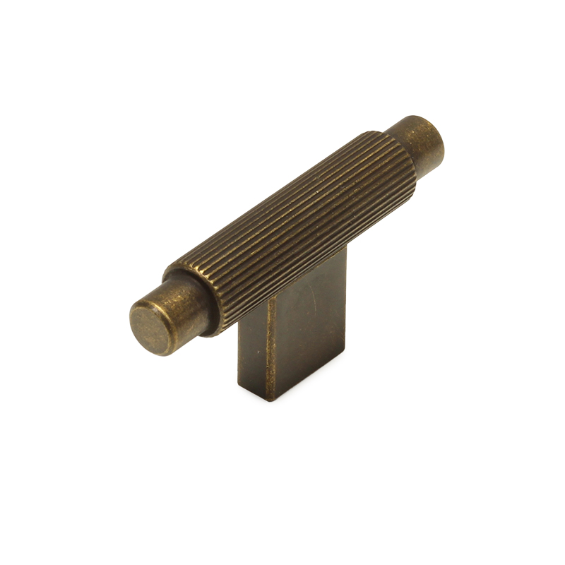 Uritettu T-nuppi Arpa, leveys 70 mm ja korkeus 37 mm. Materiaali samakki. Väri antiikki messinki.