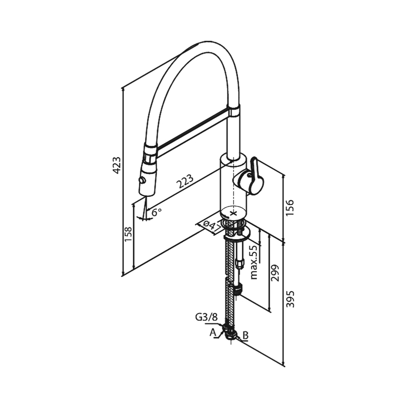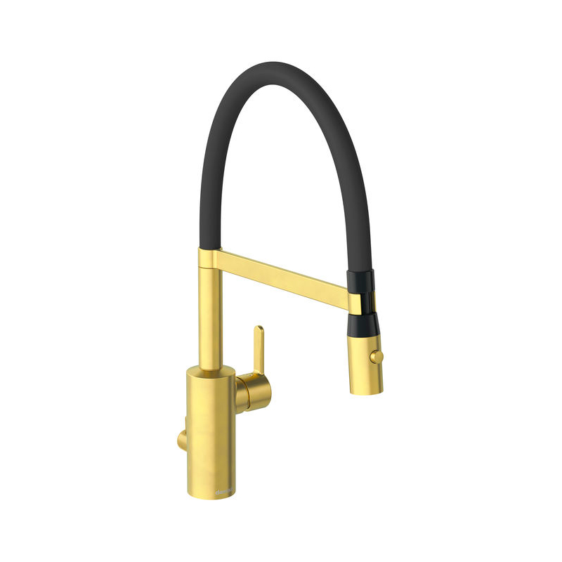 Harjattu messingin värinen keittiöhana joustavalla juoksuputkella ja pesukoneventtiilillä. Keraaminen säätökasetti, jossa kuumavesisuojaus. Kääntyvä juoksuputki, 120° kääntymisen rajoituksella.