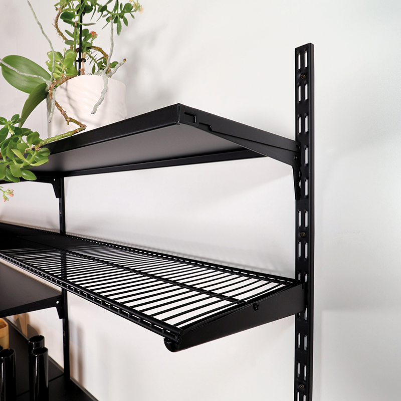 Element System 32 -sarjan teräshyllynkannattimille soveltuva hylly 80×35 cm, mattamusta. Myydään pareittain.