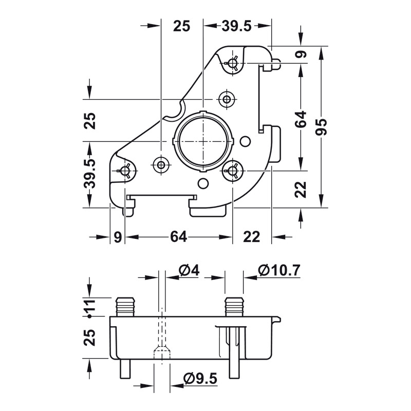 Häfele Axilo78 -systeemin tappikiinnitteinen kolmiolaippa. – koko: 25 x 95 x 95 mm