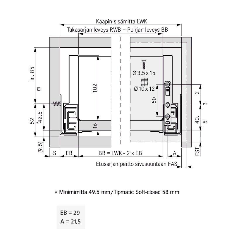 Grass Nova Pro (Scala ja One) -laatikon etusarjakiinnitin laajenevalla käpytapilla 90 ja 186 mm korkealle laatikolle. 186 mm korkealle Scalan laatikolle tarvitaan myös lisäkiinnitin G81085. Myydään kappaleittain. 100 kpl/ltk.