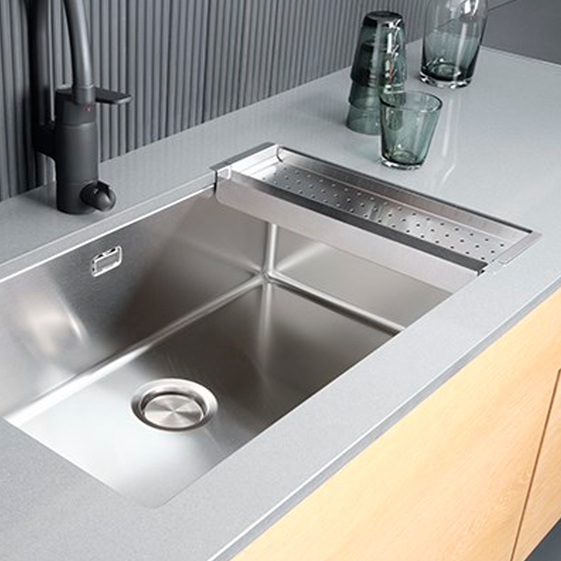 Materiaalina modernisti kuvioitu ruostumaton teräs.