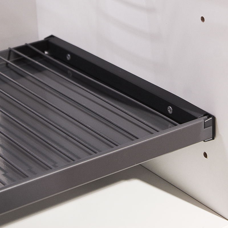 Antrasiitin värinen tippuvesisuoja astiankuivauskaappiin. Tippuvesisuoja asetetaan ritilänkannatinlistassa olevaan uraan. Se auttaa keräämään kuivuvista astioista tippuvan veden, jolloin kaapin pohja pysyy kuivana ja vahingoittumattomana.