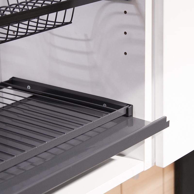 Antrasiitin värinen tippuvesisuoja astiankuivauskaappiin. Tippuvesisuoja asetetaan ritilänkannatinlistassa olevaan uraan. Se auttaa keräämään kuivuvista astioista tippuvan veden, jolloin kaapin pohja pysyy kuivana ja vahingoittumattomana.