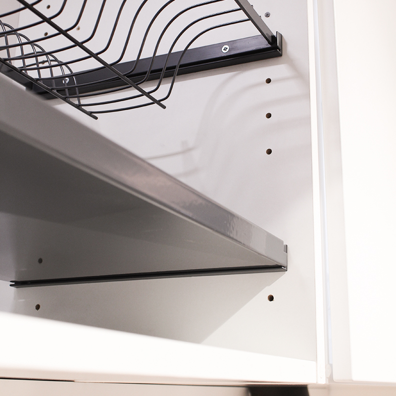 Antrasiitin värinen ritilänkannatinlista astiakaapinhyllyille. Kiinitetään kalusterunkoon sekä 5mm tapeilla että ruuveilla. Myydään pareittain. Tappien säätöväli 185 - 240 mm.