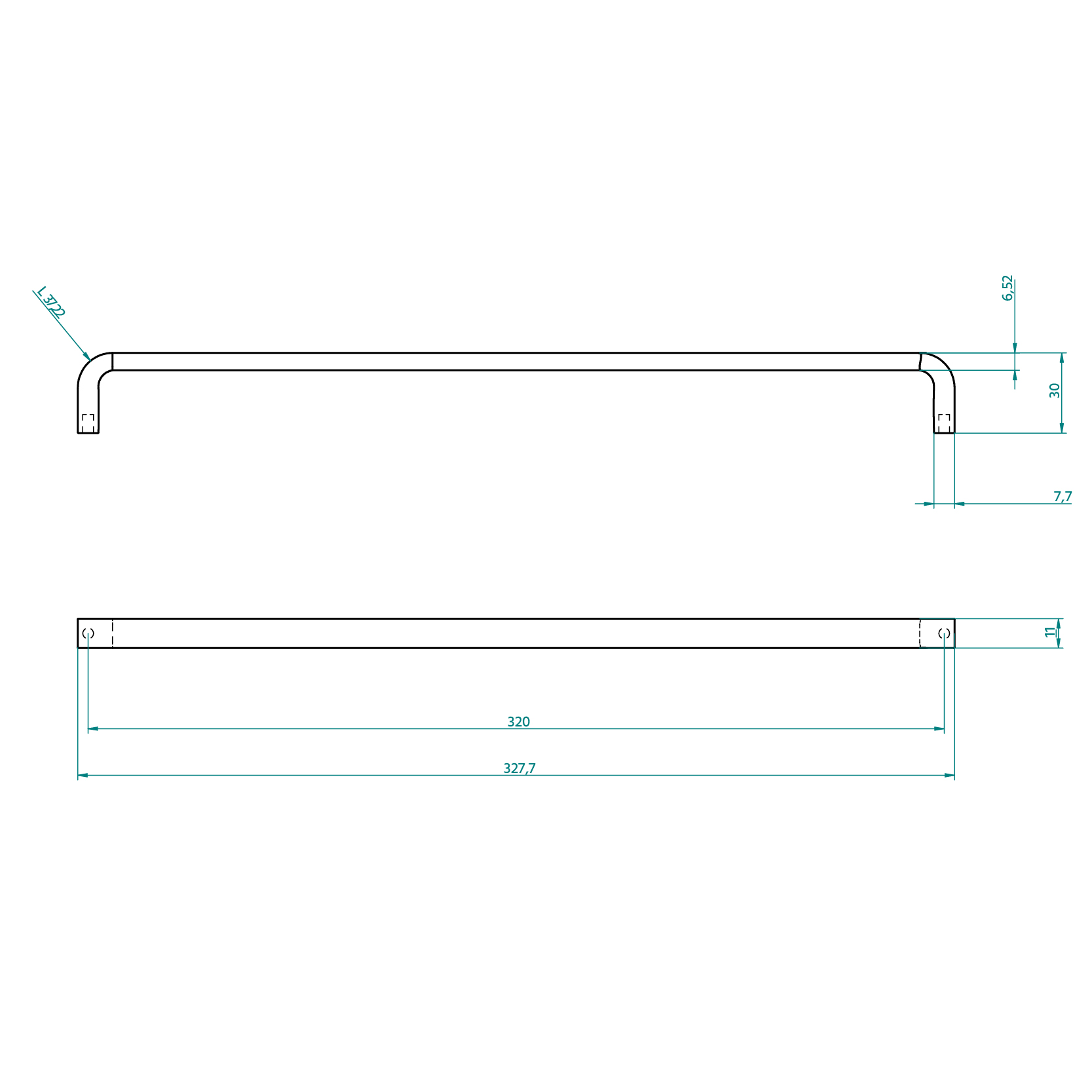 Uusi kaareva, sulavalinjainen vedin Beta Mini 320 mm reikäjaolla. Vetimen kokonaisleveys 327 mm, korkeus 11 mm ja syvyys 30 mm. Materiaali pinnoitettu samakki, väri kiiltävä kromi.