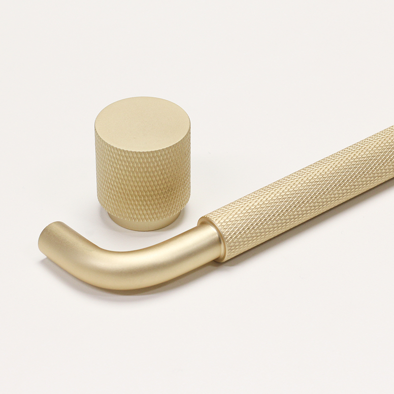 Industrial lookin rihlattu uutuusnuppi INX. Väri himmeä messinki. Nupin 5mm korkean jalkaosan Ø20mm, nupin rihlattu osa Ø25mm. Korkeus 28mm. Materiaali alumiini. Vedinruuville kierre M4x8mm.