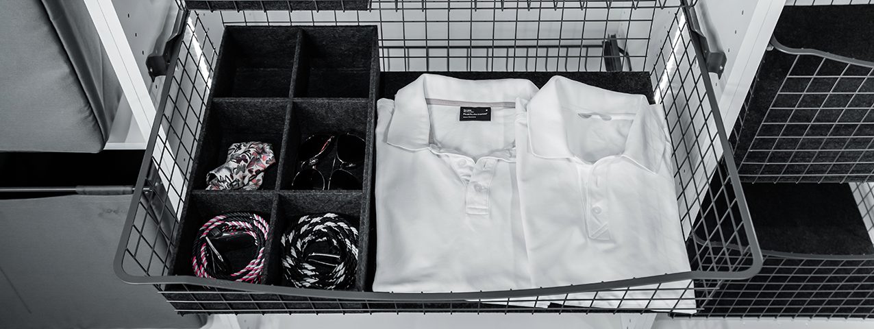 Järjestelmään on saatavilla mm. rullakisko- ja tekstiilikorit, kenkä- ja housutelineet sekä tangot henkarissa säilytettäville vaatteille. Lisävarusteina saatavana varustelokerikko pienille asusteille, kuten vöille.